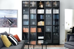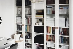 Busca estantes resistentes: Si tu sueño de estantería empotrada aún no se ha logrado (suspiro), la mejor opción es un conjunto de estanterías altas y resistentes que soporten el peso de muchos libros. Los estantes cerrados pueden ser ideales para evitar que los libros se salgan por la parte trasera.