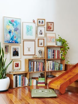 Añade toques personales: Aquí se trata de mostrar tu personalidad. Agrega fotografías, ilustraciones, recuerdos y otros objetos que sean importantes para ti. También puedes agregar obras de arte, por ejemplo, algunos cuadros apoyados o colgados en la misma estantería. Estos pequeños detalles son los que realmente harán que tu espacio se destaque. Sólo recuerda que los protagonistas son los libros.