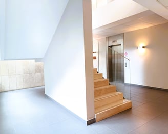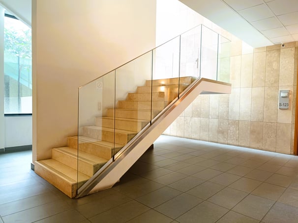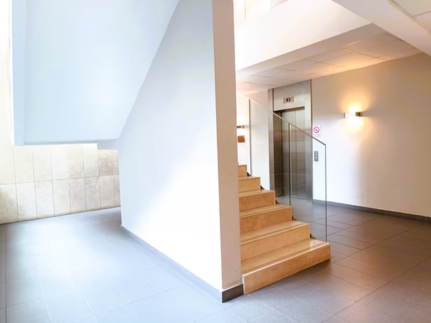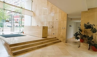 Está ubicada en un lindo edificio con hermosas áreas verdes.